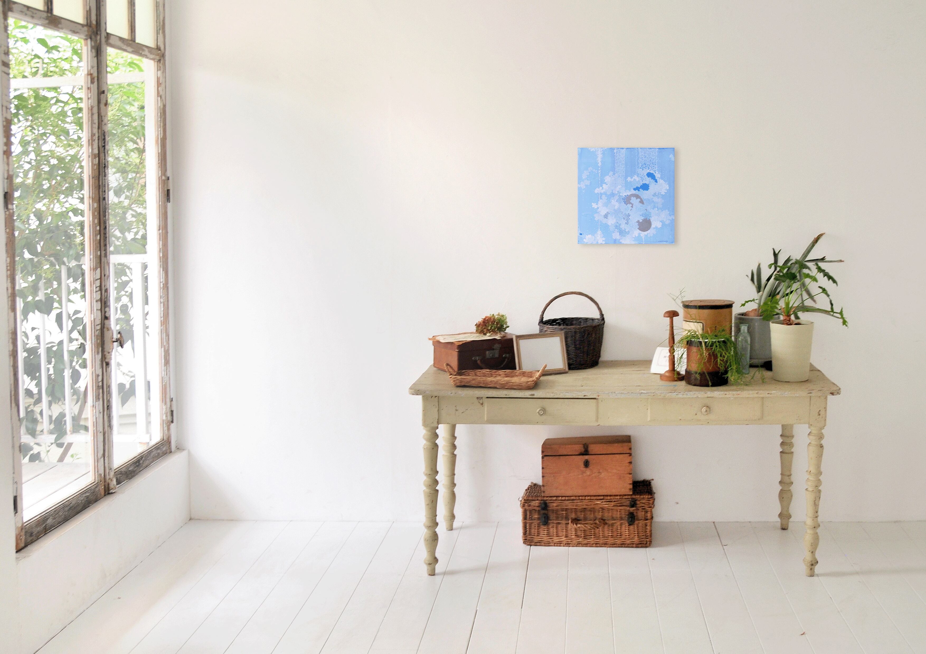 私は普段、心の音をテーマに絵画として二次元に描かれた心の空間と実際の展示空間である三次元に音楽や立体などで構成したインスタレーションで表現しています。