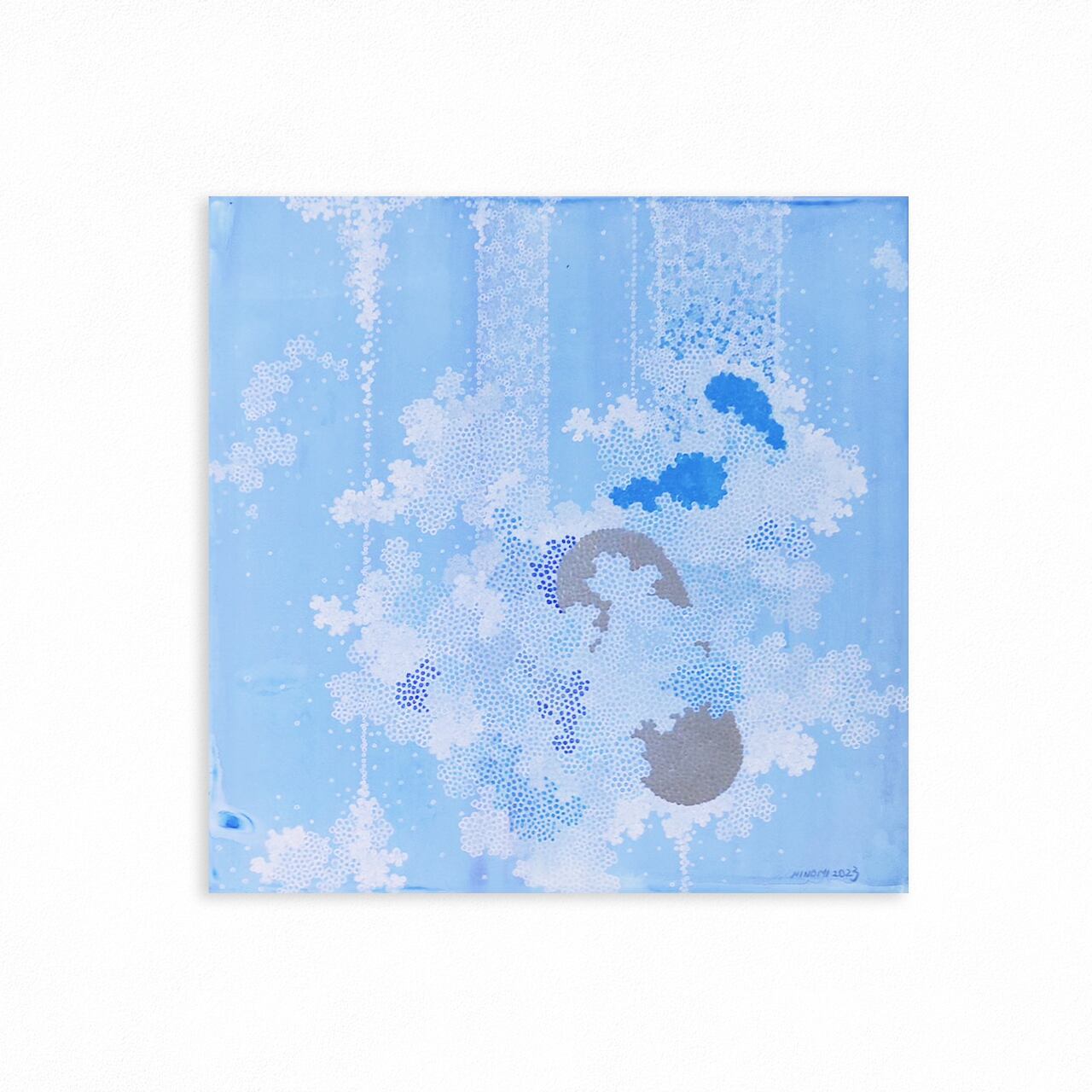 ここでいう心の音というのは、感情ではなくそれになる前の状態の音を指しています。私はアファンタジアという脳の特性ゆえに視覚的な心象イメージをもたず、その瞬間瞬間に在る何か(私は音の粒と言っています)を丸をつかって深層に湧き出てくる深度の異なる青の世界に描き出すことで、正負どちらでもない0地点に在る音を作品として昇華しています。